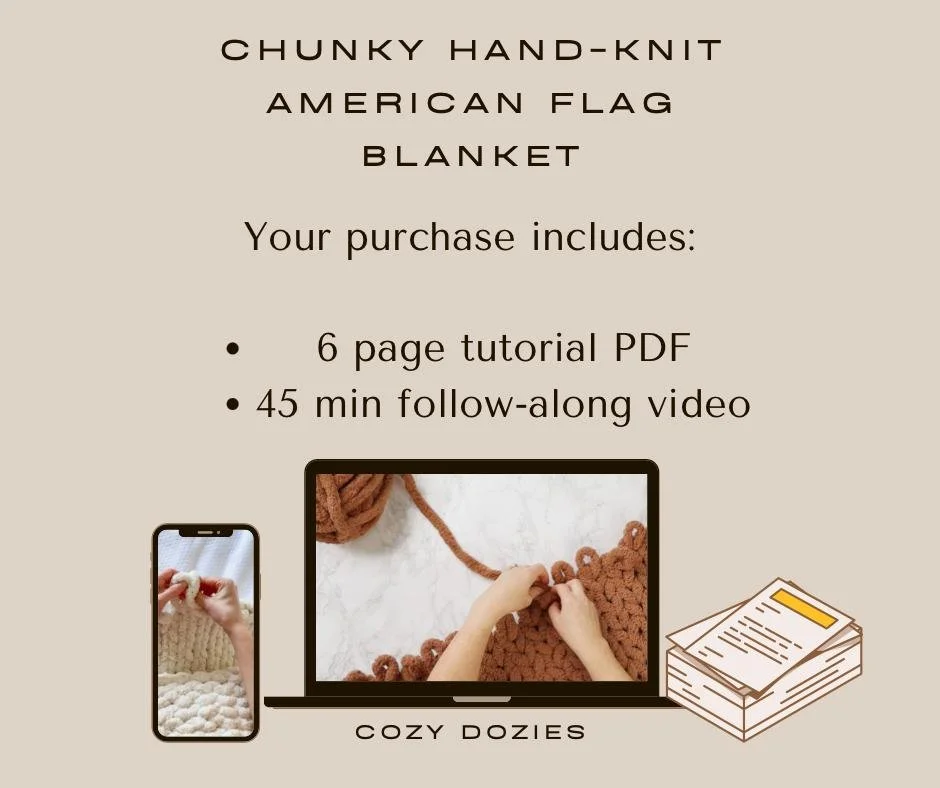 This digital-only tutorial provides clear instructions on creating a chunky American flag blanket. Included is a 45-minute video guide, accessible via a link in the written PDF instructions (found on the 3rd page), which walks you through the knitting process from beginning to end.