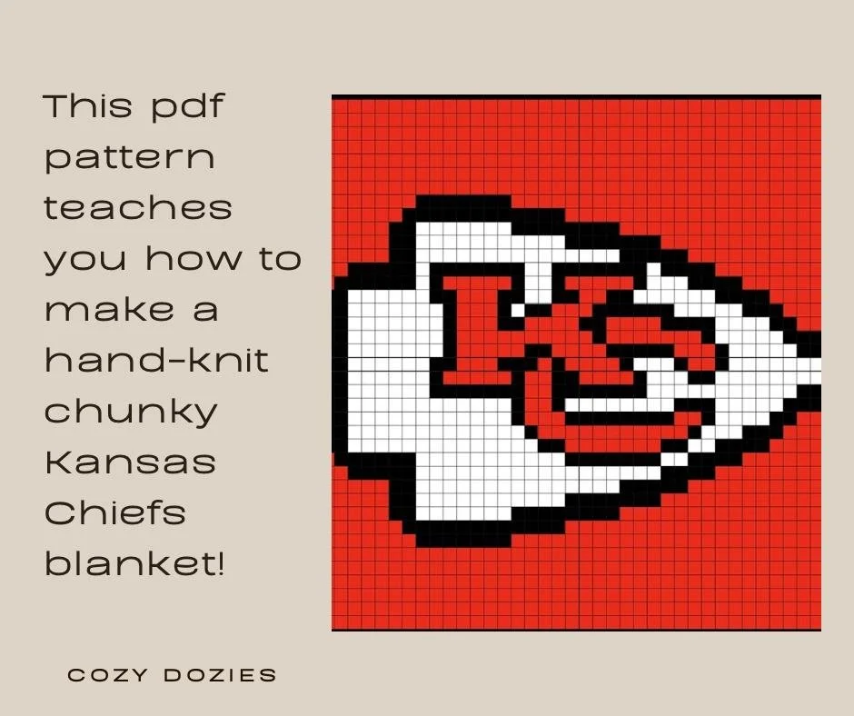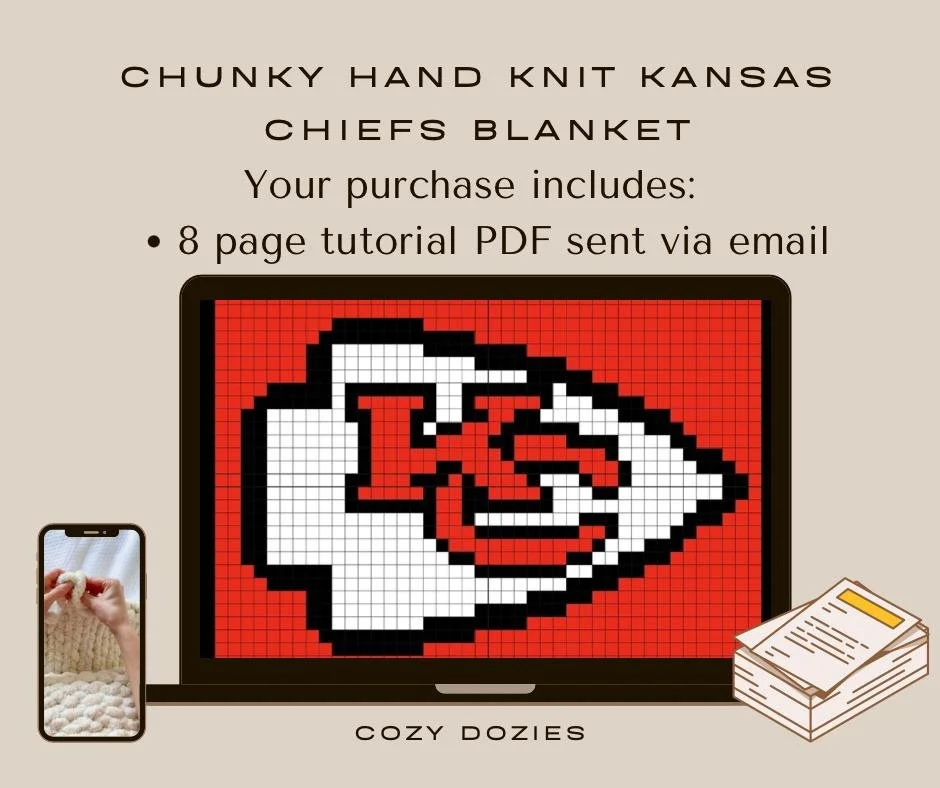 PDF Pattern for a chunky hand-knit Kansas City Chiefs Blanket! Blanket size is about 3’4” x 5’6”. Size can vary depending on how tight or loose your knitting is! (39 st x 42 st)